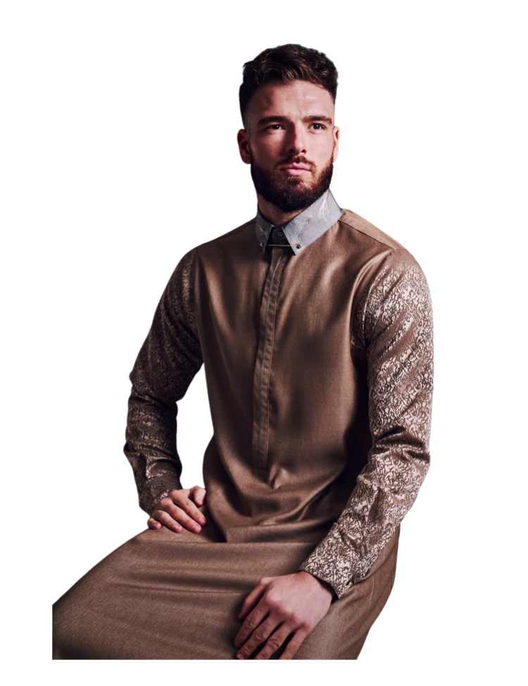 LAWUNG MEN'S DESERT GOLD THOBE WITH PATTERNED SLEEVES FROM UK