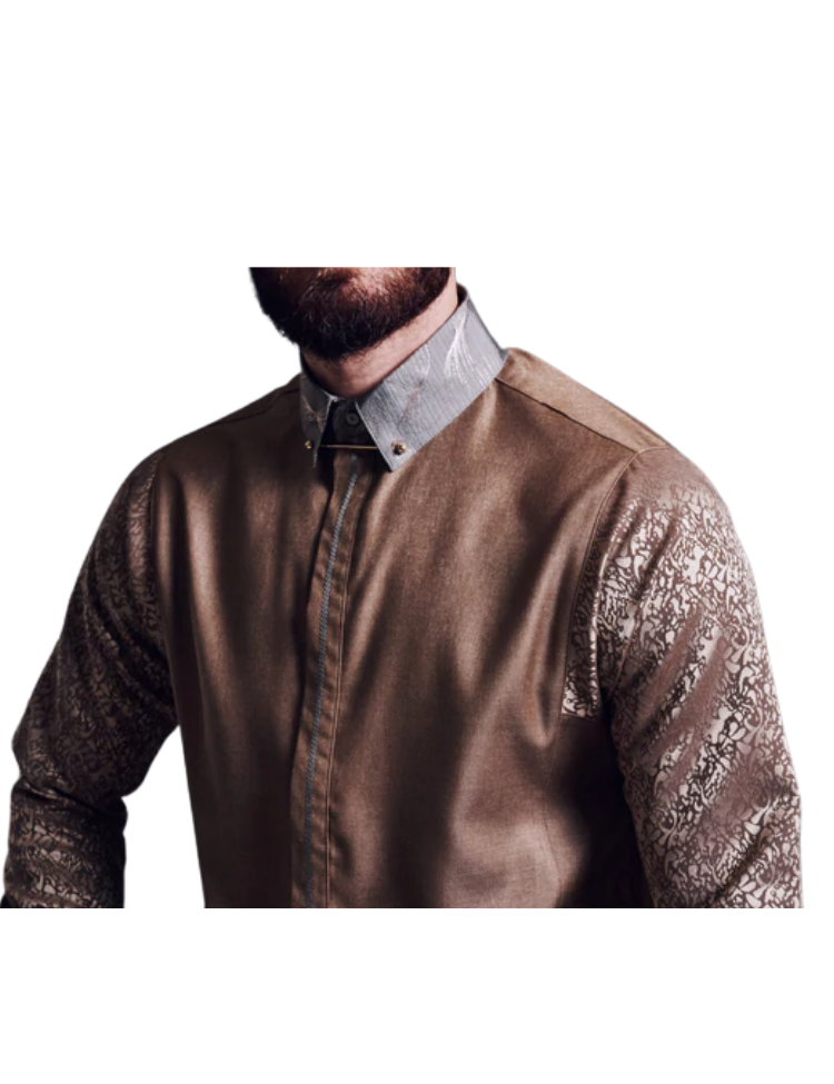 popular cross fabric sleeve designs that has been apparent in its recent success. We have ultra rich golden infused metallic fabric on the collar and a large silver button to compliment, we have also cross stitched embroidery on the chest area with a concealed zipper beneath,